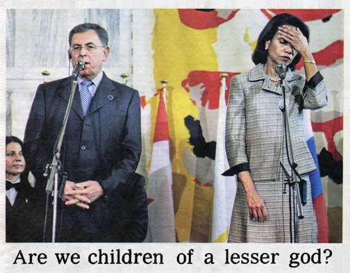 Cartoon (07/27/06, from text by Craig S. Smith and Helene Cooper, photo by Andreas Solaro)