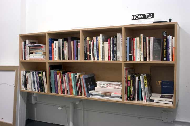 bookshelf, signage, flyers, sign-in sheet, rubber stamp, ink,
