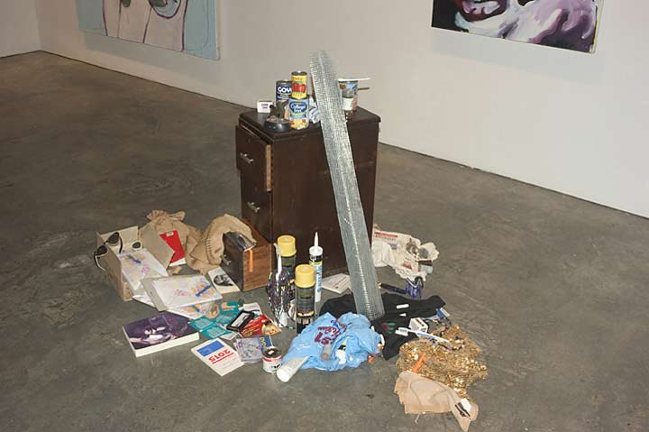 Mixed media including wooden chest of drawers, spray insulation, canned foods, condoms, clothing and books