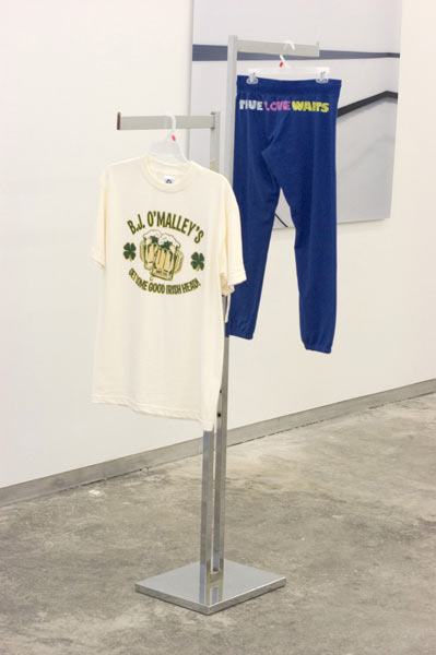 Men’s cotton t-shirt reading “B.J. O’Malley’s, get some good Irish head”, women’s cotton sweatpants reading “TRUE LOVE WAITS,” original hangers and price tags, chrome display rack