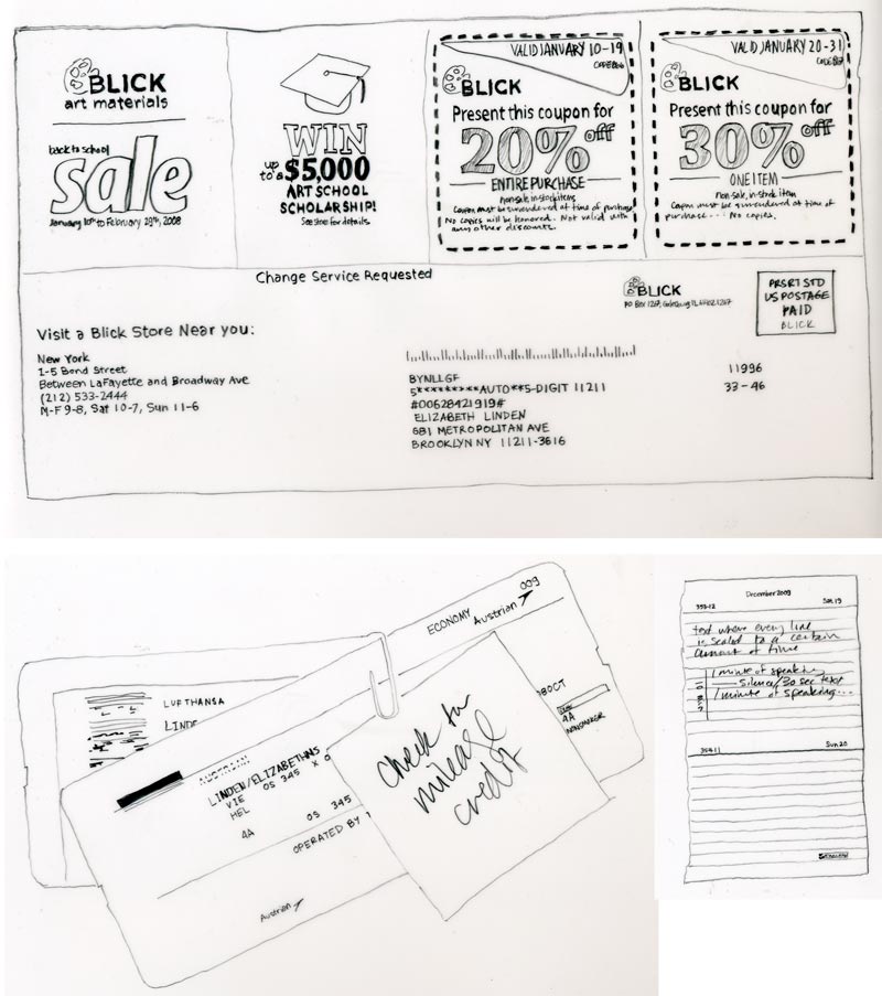 business cards, invitations, junk mail, etc. Three drawings from